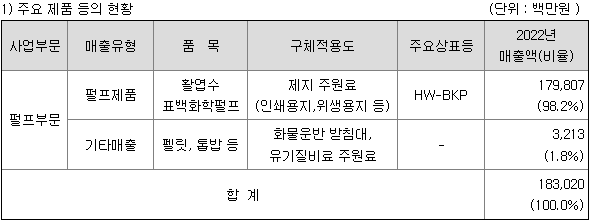 인쇄용지, 산업용지 등 제지원료로 사용되는 표백화학펄프를 생산하여 판매하고 있으며 부산물로