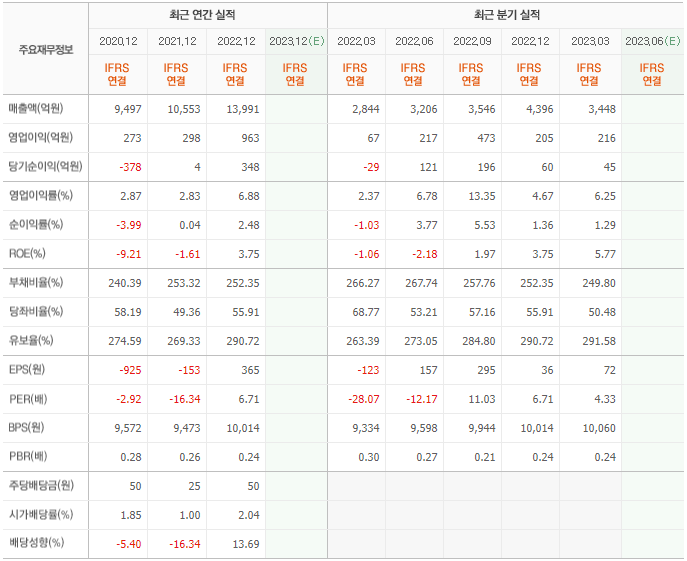 2022년 매출은 1조 3991억, 영업이익은 963억, 당기순이익은 348억입니다. 그리고 영업이익률은 6.88%입니다.