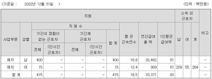 | 사업부문 | 성별 | 직원수 | 평균근속연수 | 평균연봉(백만) |