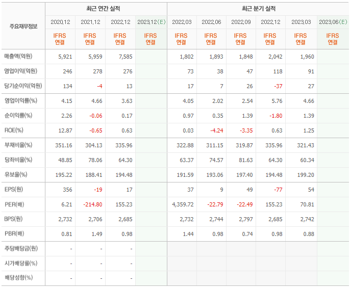 2022년 매출은 7585억, 영업이익은 276억, 당기순이익은 13억입니다. 그리고 영업이익률은 3.63%입니다.