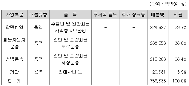 당사는 전국의 주요 항만 및 물류거점을 통한 네트워크 시스템을 구축하고, 항만하 역 및 육상ㆍ해상운송사업을 근간으로 초중량물 운송ㆍ설치와 3자물류(3PL), 컨테 이너터미널, 물류센터 운영 등의 물류사업을 주된 사업으로 영위하고 있습니다.