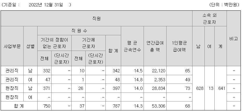 | 사업부문 | 성별 | 직원수 | 평균근속연수 | 평균연봉(백만) |