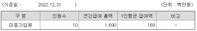 미등기임원의 평균연봉은 1억 6900만원이고 직원수는 10명입니다.