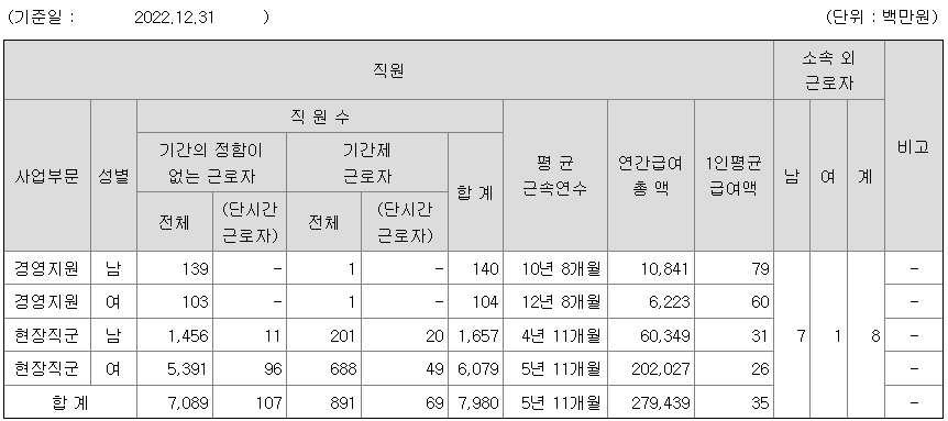 | 사업부문 | 성별 | 직원수 | 평균근속연수 | 평균연봉(백만) |