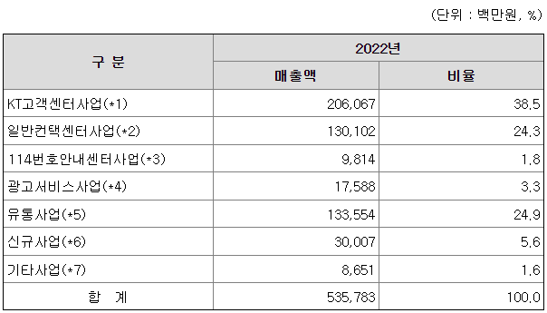 회사는 컨택센터사업, 광고서비스 상품판매 사업, 유통사업을 주로 영위하고 있습니다. 세부 사업별 비중은 2022년 매출 기준 KT고객센터사업 38%, 고객컨택센터사업(Open Market) 24%, 114번호안내와 우선번호안내 사업 5%, 유통사업 25%, 신규사업 6%, 기타사업 2%로 구성되어 있습니다.