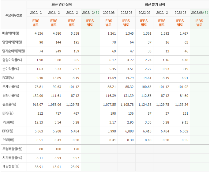 2022년 매출은 5358억, 영업이익은 195억, 당기순이익은 159억입니다. 그리고 영업이익률은 3.65%입니다.