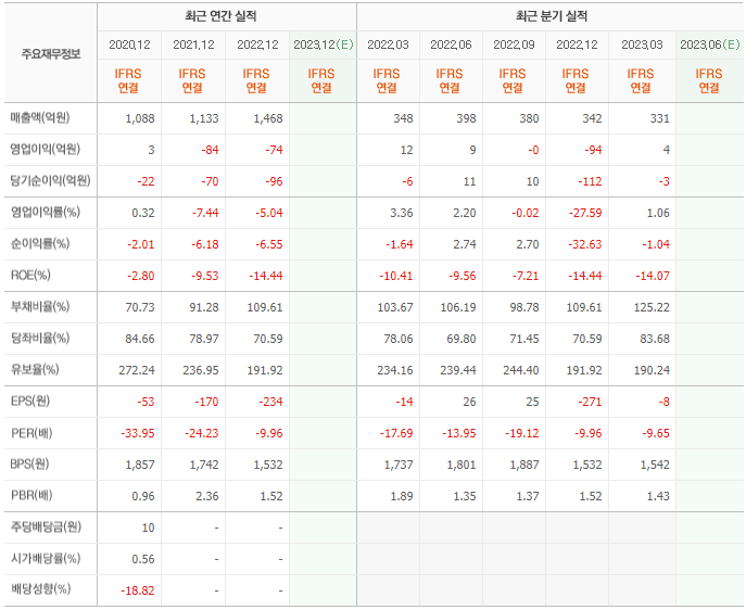 2022년 매출은 1468억, 영업이익은 -74억, 당기순이익은 -96억입니다. 그리고 영업이익률은 -5.04%입니다.