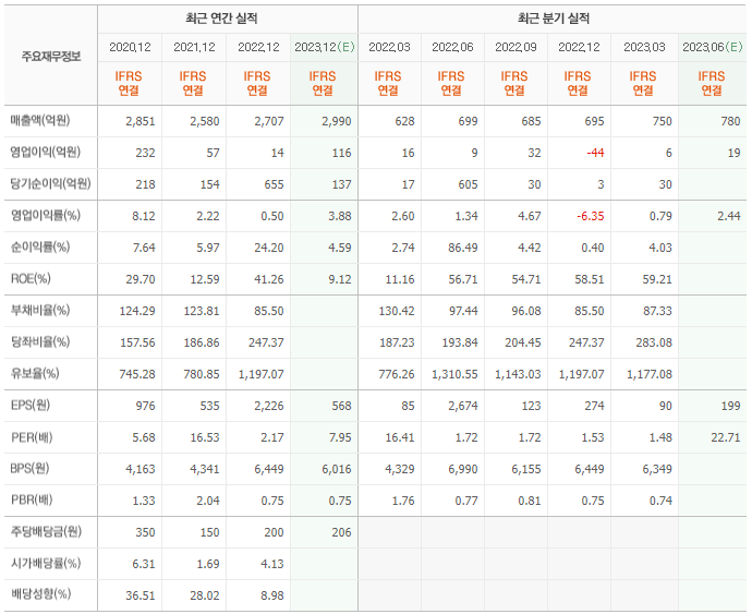 2022년 매출은 2707억, 영업이익은 14억, 당기순이익은 655억입니다. 그리고 영업이익률은 0.50%입니다.
