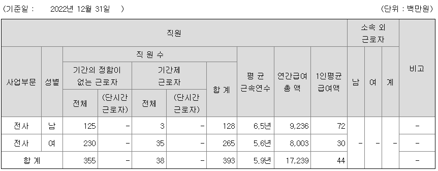 | 사업부문 | 성별 | 직원수 | 평균근속연수 | 평균연봉(백만) |