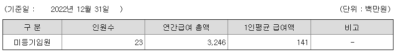 미등기임원의 평균연봉은 1억 4100만원이고 직원수는 23명입니다.