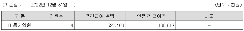 미등기임원의 평균연봉은 1억 3000만원이고 직원수는 4명입니다.