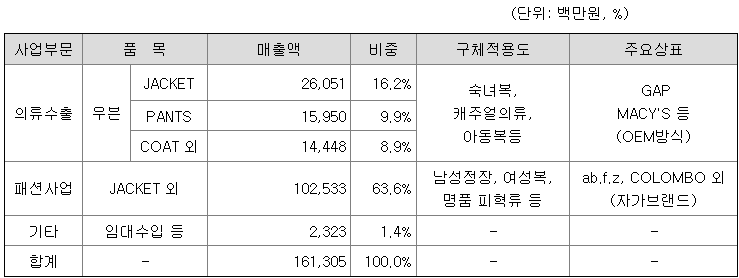 연결회사의 사업부문은 제품과 용역의 성격에 따라 3개 부문(의류수출,패션사업,기타)으로 구분하고 있습니다. 그에 따른 사업부문별 현황을 요약하면 아래와 같습니다