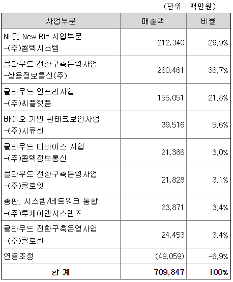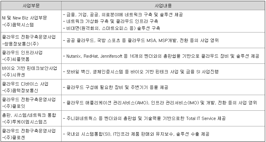 당사의 연결종속회사는 총 9개사로 상장사 2개사(코스닥 : 쌍용정보통신(주), 코넥스 : (주)시큐센) 와 비상장사 7개사가 포함되어 있습니다. 종속회사중 투자목적 회사를 제외하고 실제 영업활동을 하는 사업부문은 아래와 같이 구분할 수 있습니다.