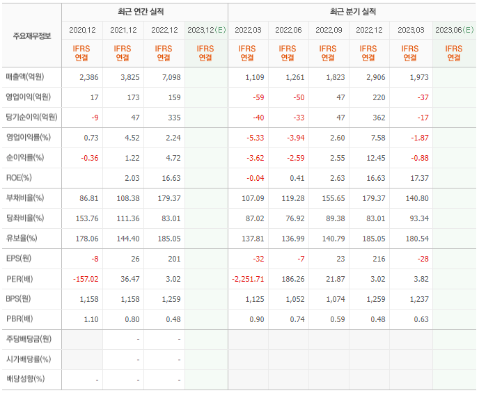 2022년 매출은 7098억, 영업이익은 159억, 당기순이익은 335억입니다. 그리고 영업이익률은 2.24%입니다.