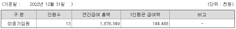 미등기임원의 평균연봉은 1억 4400만원이고 직원수는 13명입니다.