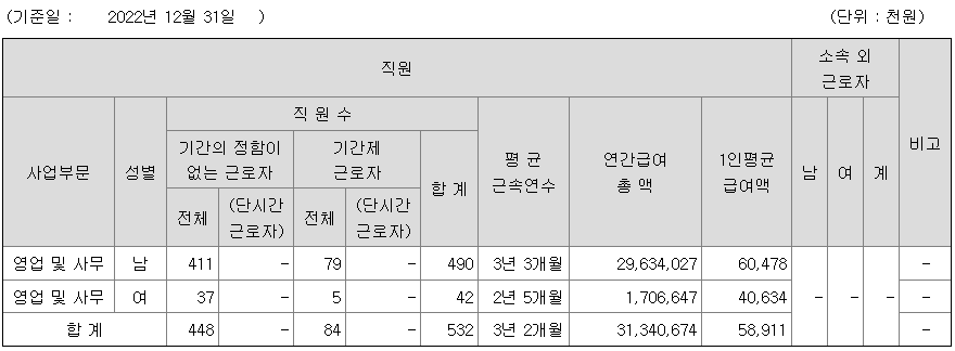 | 사업부문 | 성별 | 직원수 | 평균근속연수 | 평균연봉(백만) |