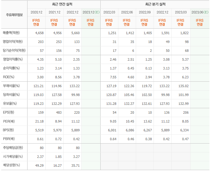 2022년 매출은 5660억, 영업이익은 133억, 당기순이익은 75억입니다. 그리고 영업이익률은 2.35%입니다.