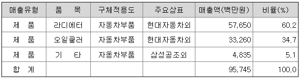 연결실체는 자동차, 중장비, 농기계 등에 사용되는 라디에터, 오일쿨러 등을 생산하여 OEM업체에 납품하고 있으며, 총매출액의 30.8%를 직수출하고 있습니다. 또한, 일부 품목과 부속품 등을 보수용 시장을 통해 직접 공급하고 있습니다.