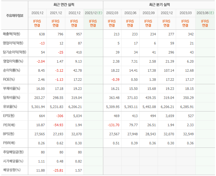 2022년 매출은 957억, 영업이익은 87억, 당기순이익은 410억입니다. 그리고 영업이익률은 9.13%입니다.