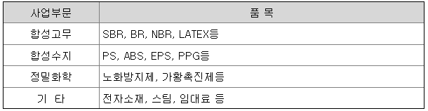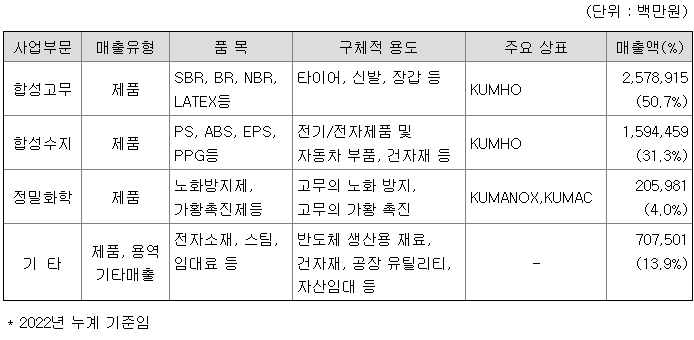 금호석유화학(주)의 주요 사업부문별 제품은 다음과 같습니다.