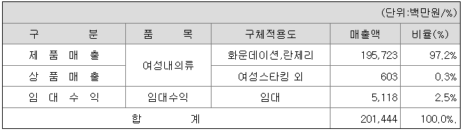 당사는 여성내의류를 전문으로 생산, 판매하고 있으며 제품 매출의 대표 브랜드는 비너스, 와코루, 솔브, 마더피아, 자스민, 아르보, 리맘마, 트레노, 아네타등이 있습니다. 또한, 여성스타킹 등의 상품을 판매하고 있으며 그 밖에 임대수익이 있습니다.