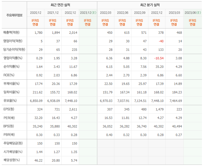 2022년 매출은 2014억, 영업이익은 66억, 당기순이익은 235억입니다. 그리고 영업이익률은 3.28%입니다.