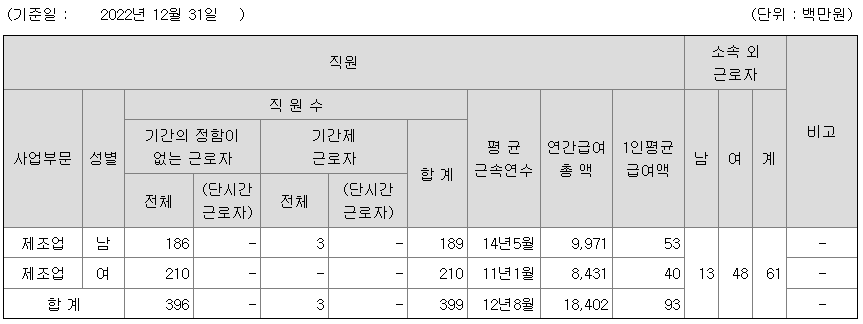 | 사업부문 | 성별 | 직원수 | 평균근속연수 | 평균연봉(백만) |