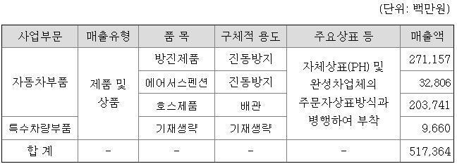 당사는 방진부품, 에어서스펜션 부품, 호스부품 및 방위산업용 특수차량 부품을 생산, 판매하고 있습니다. 이에 대한 세부내용은 다음과 같습니다.