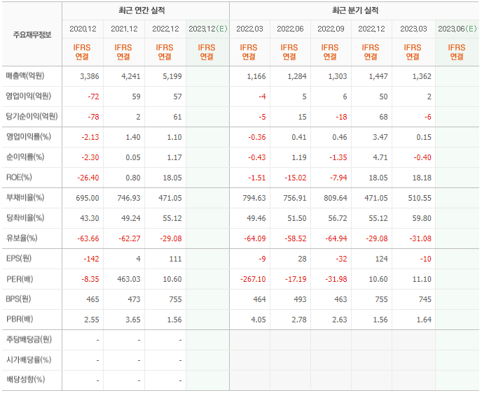 2022년 매출은 5199억, 영업이익은 57억, 당기순이익은 61억입니다. 그리고 영업이익률은 1.10%입니다.
