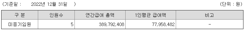 미등기임원의 평균연봉은 7700만원이고 직원수는 5명입니다.