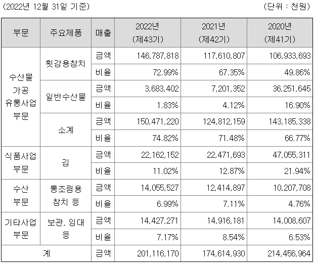 당사의 주요 사업인 횟감용 참치의 가공 및 유통사업은 국내 원양업체들이 태평양, 인도양 등에서 어획한 참치를 절단, 가공하여 국내외 소비자들에게 유통하는 사업입니다.