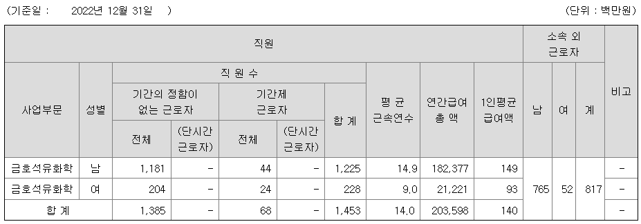 | 금호석유화학 | 남 | 1,225 | 14.9 | 149 |