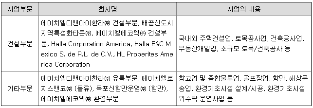 건설사업부문은 아파트/오피스텔/주상복합/지식산업센터/물류센터 등 주택 및 건축분야, 항만/공항/도로/철도 등 토목분야 등이 있습니다. 기타사업부문으로는 물류단지 운영 및 임대, 항만/해상운송업, 폐기물/수처리분야 설계,시공,운영 등의 영업을 영위하고 있습니다.