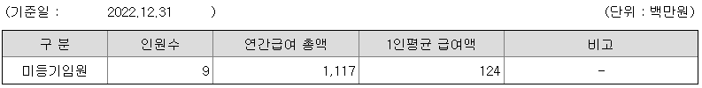 미등기임원의 평균연봉은 1억 2400만원이고 직원수는 9명입니다.