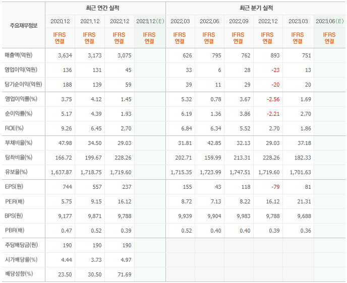 2022년 매출은 3075억, 영업이익은 45억, 당기순이익은 59억입니다. 그리고 영업이익률은 1.45%입니다.
