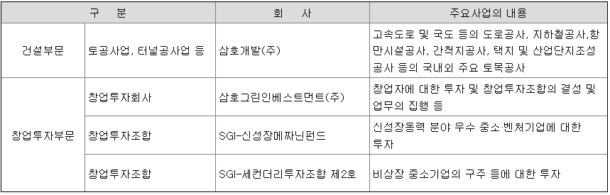지배회사와 그 종속회사(이하 "연결회사"라 함)는 수익을 창출하는 재화와 용역의 성격, 이익 창출단위,  사업부문 구분의 계속성 등을 고려하여 경영의 다각화 실태를 적절히 반영할 수 있도록 건설부문과 창업투자부문으로 사업을 구분하고 있습니다.