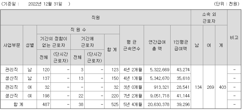 | 생산직 | 여 | 220 | 7년 2개월 | 41 |