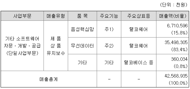 당사는 통신 솔루션을 개발 공급 하는 단일 사업부이나, 제품의 특성을 설명하기 위해 음성핵심망 솔루션, 무선데이터 솔루션, 요소기술의 3가지로 품목을 구분하고 있습니다. 음성핵심망 솔루션의 대표적인 제품에는 가입자의 위치정보와 서비스정보를 관리하는 HLR/UDM과 이동통신 사업자간의 국제 로밍서비를 가능하게 하는 GLR 등 기본적인 음성 서비스를 가능하게 하는 솔루션들이 해당됩니다.