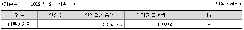 미등기임원의 평균연봉은 1억 5000만원이고 직원수는 15명입니다.