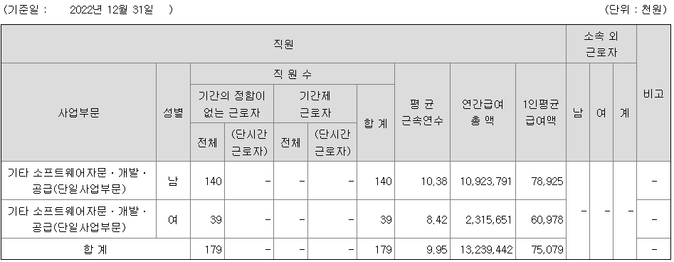 | 사업부문 | 성별 | 직원수 | 평균근속연수 | 평균연봉(백만) |