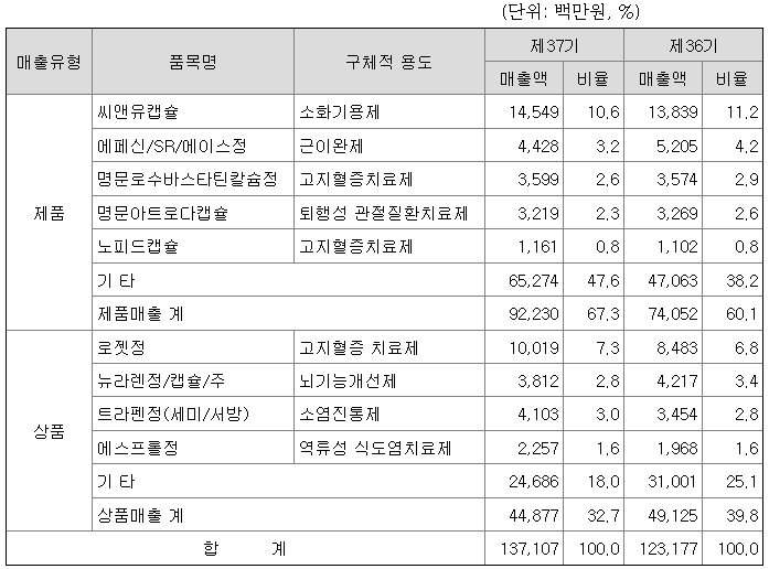 사가 영위하는 사업은 위의 표에 기재된 것과같이 크게 의약품/바이오부문, 서비스부문 2가지로 구성되어 있습니다. 제37기 연결재무제표기준 152,135백만원의 매출을 기록하였으며, 사업부문별 매출실적은 다음 표와 같습니다.