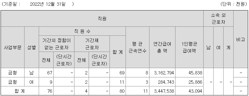 | 사업부문 | 성별 | 직원수 | 평균근속연수 | 평균연봉(백만) |