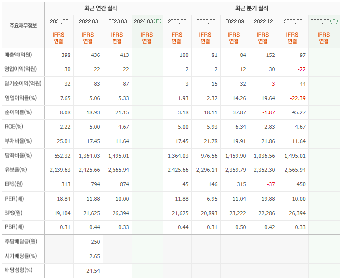 2022년 매출은 413억, 영업이익은 22억, 당기순이익은 87억입니다. 그리고 영업이익률은 5.33%입니다.