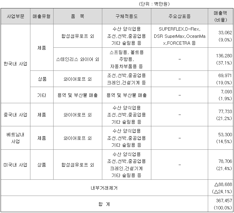 당사는 합성섬유로프, 스테인리스 와이어 등을 생산 및 판매하는 한국내 사업부문과 와이어로프 외 철강선 및 합성섬유로프 등을 제조, 판매하는 중국내 사업부문, 베트남내 사업부문 및 합성섬유로프, 스테인리스 와이어, 와이어로프 등을 판매하는 미국내 사업부문으로 구분하고 있습니다.