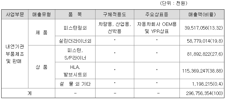 당사는 자동차 엔진 및 내연기관 부품인 피스턴링, 실린더라이너 등을 생산, 판매하고 있으며 또한 관계회사에서 생산하는 SPINY실린더라이너, 피스턴. 핀, HLA, 발브시트, Campiece 등을 상품으로 판매하고 있습니다.