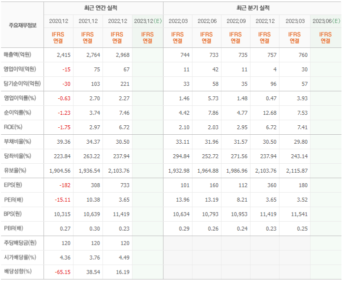 2022년 매출은 2968억, 영업이익은 67억, 당기순이익은 221억입니다. 그리고 영업이익률은 2.27%입니다.