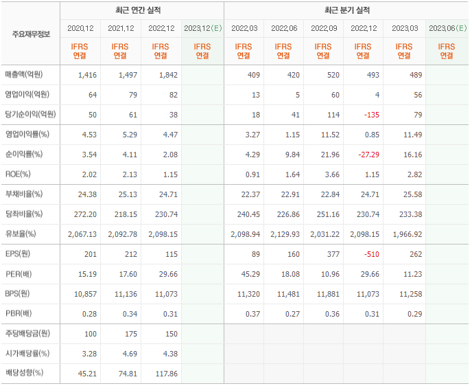 2022년 매출은 1842억, 영업이익은 82억, 당기순이익은 38억입니다. 그리고 영업이익률은 4.47%입니다.