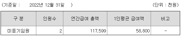 미등기임원의 평균연봉은 5800만원이고 직원수는 2명입니다.
