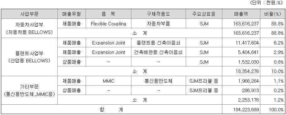 공시대상 사업부문으로 연결대상 종속회사가 영위하는 주요 사업은 제품의 특성 및 사용처에 따라 자동차 사업부(자동차용 BELLOWS), 플랜트 사업부(산업용 BELLOWS) 및 기타부문(통신용반도체_MMIC등)으로 구분하고 있습니다.