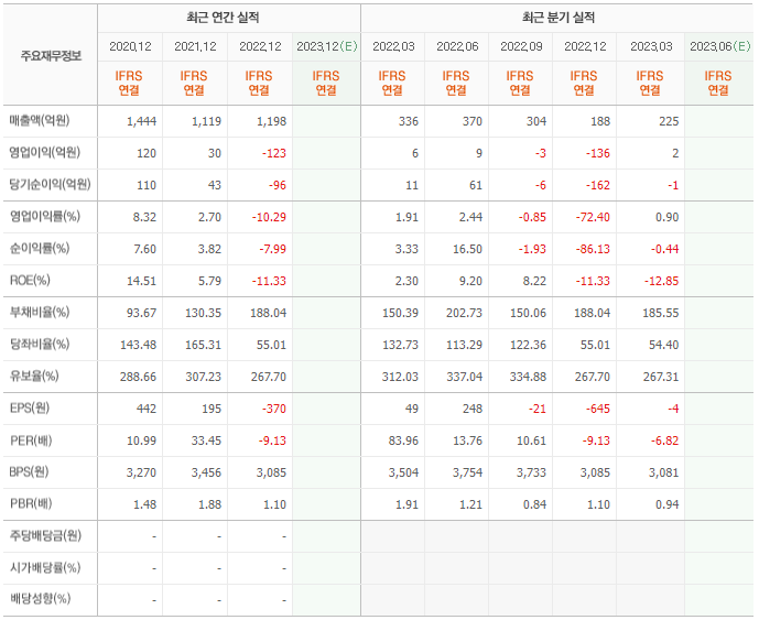 2022년 매출은 1198억, 영업이익은 -123억, 당기순이익은 -96억입니다. 그리고 영업이익률은 -10.29%입니다.